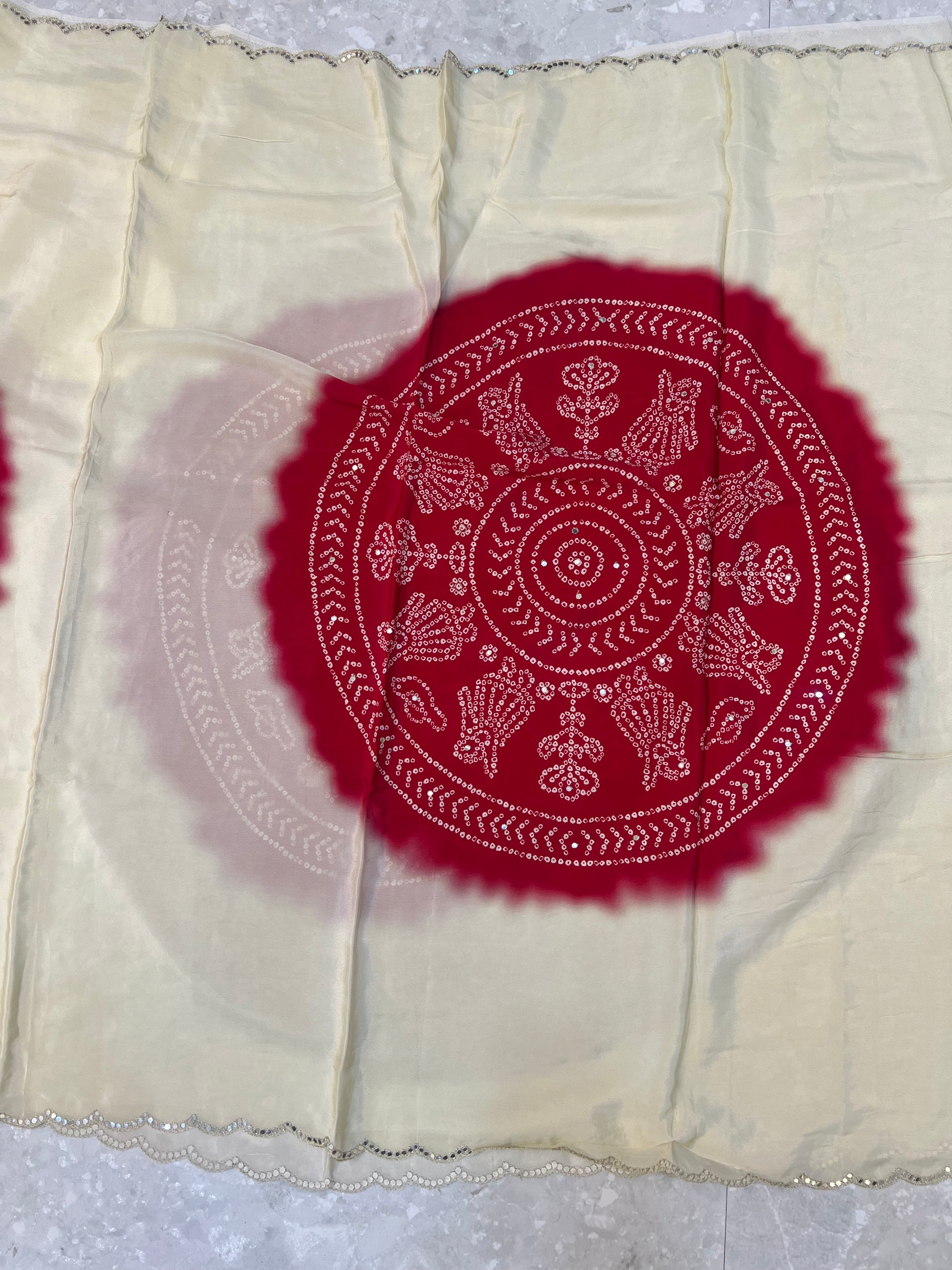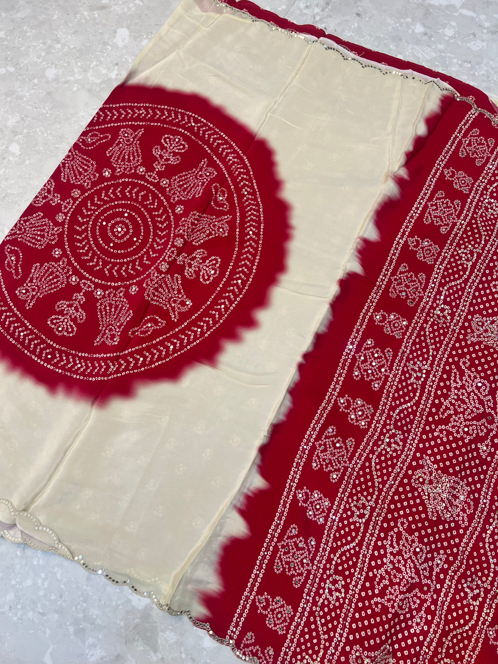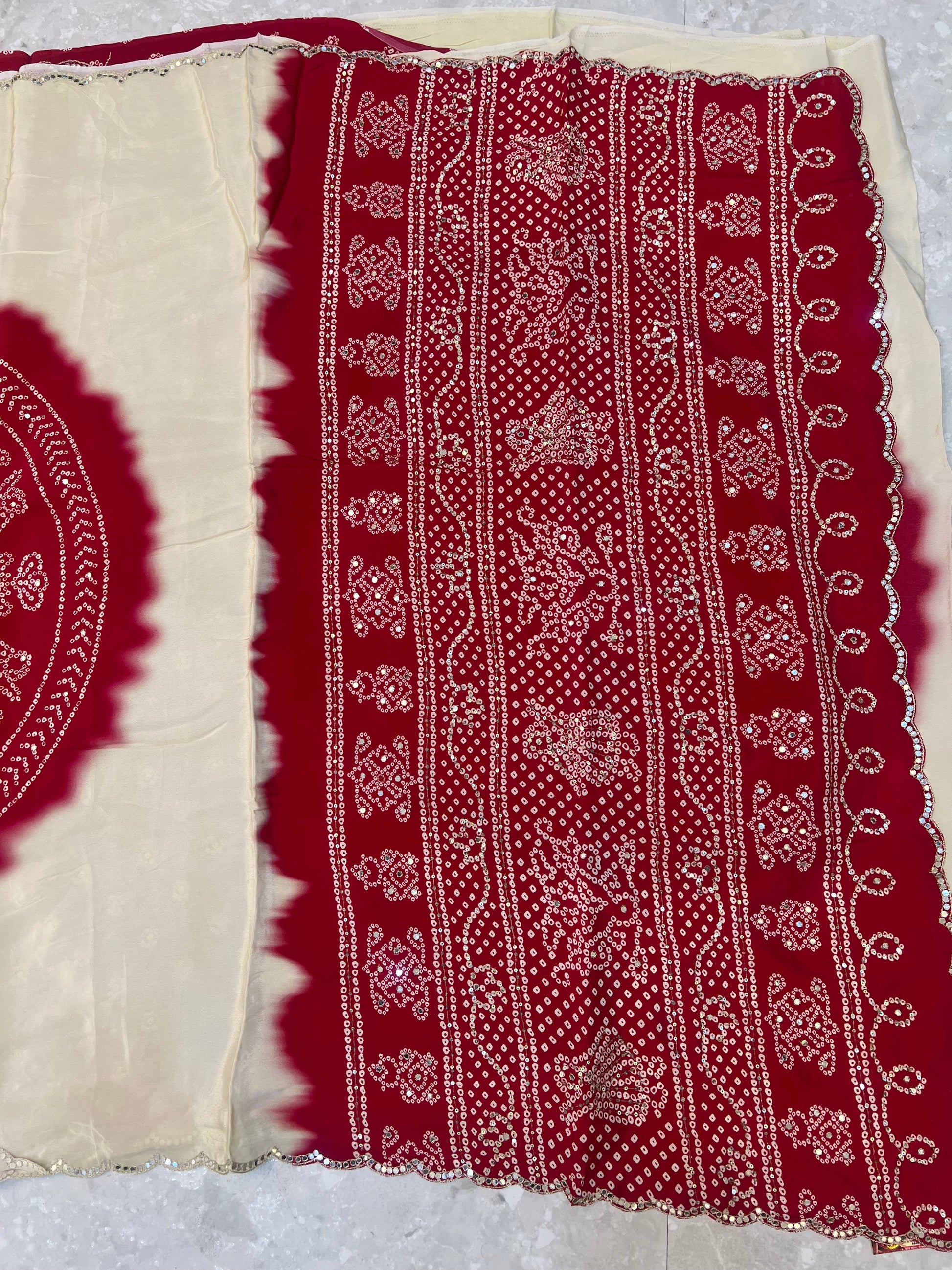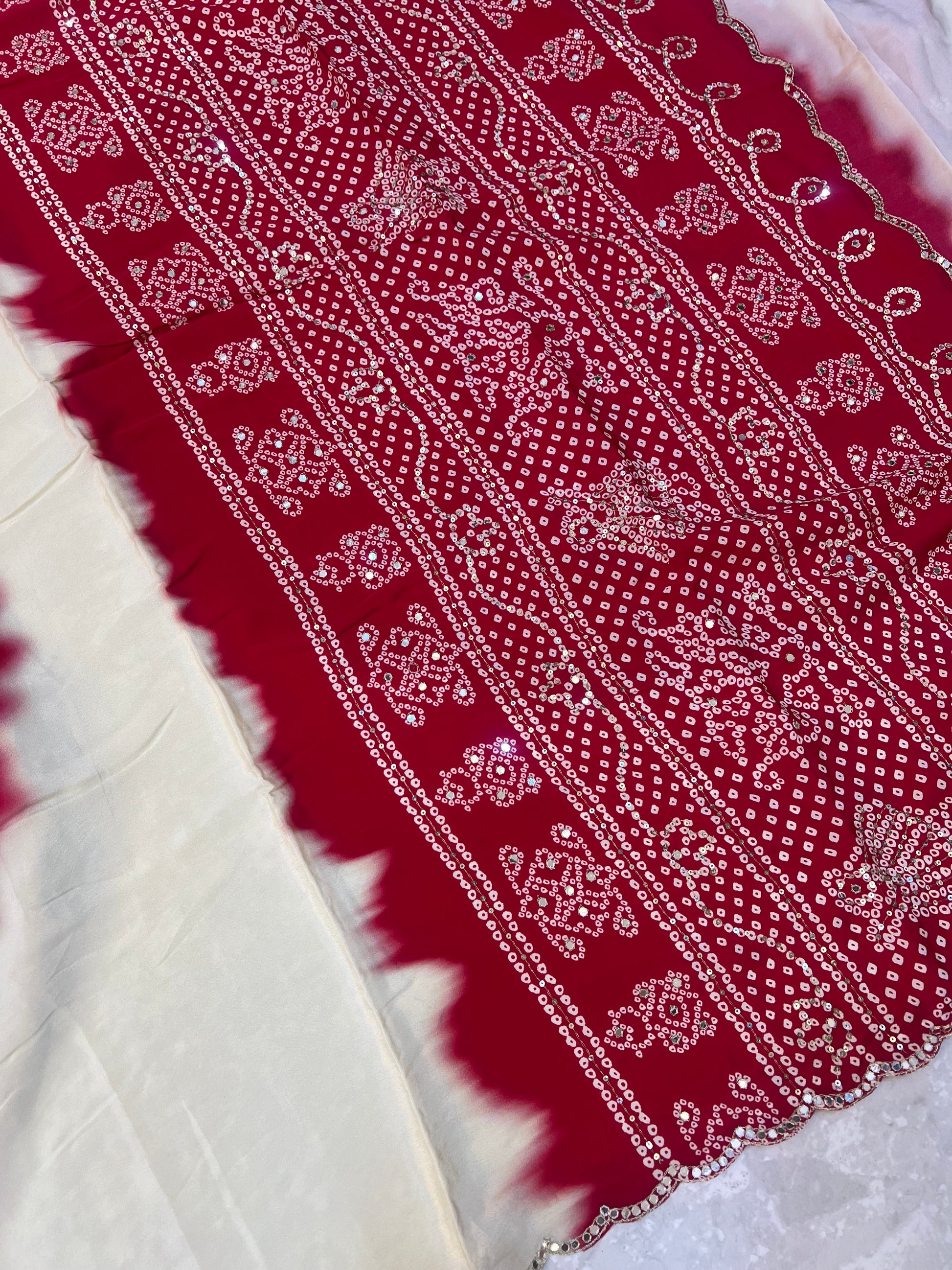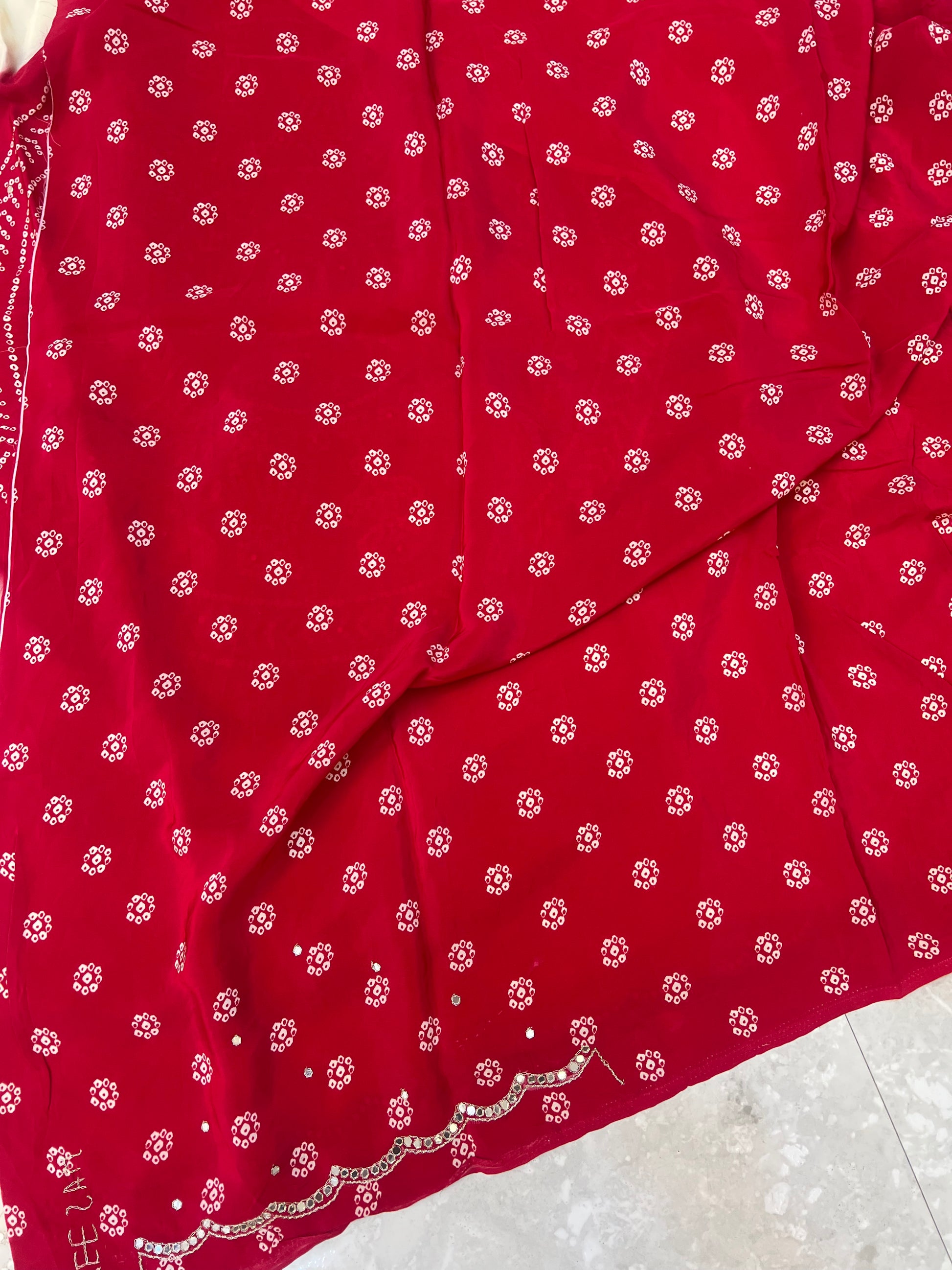 Beautiful pure crepe silk bandhani saree with the mirror and aari work all over the saree , paired with the red color blouse ✨❤️💃🏻