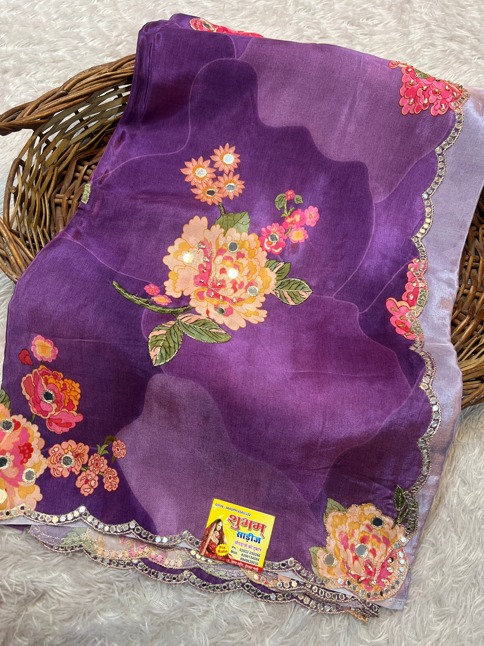 Have a look at this lavender color digital print crepe silk saree with the beautiful mirror work on the saree and the highlighting work the flowers .